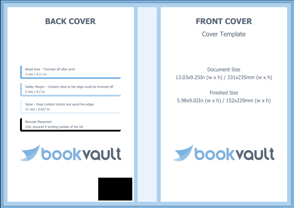 The template will detail the bleed area, where is safe to put content and the spine so you can make sure the book you receive back will be as intended. This document will also detail the final size of the document, so you can use this information to create a file in your design programme at the required size, and then drop this template onto it and design around it.