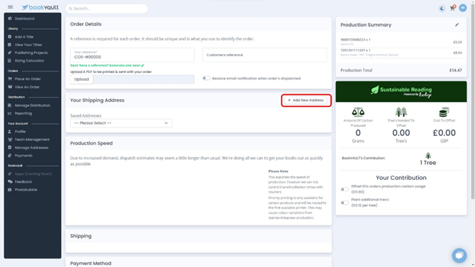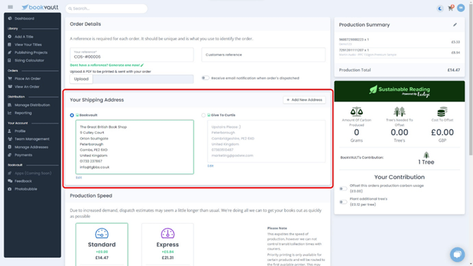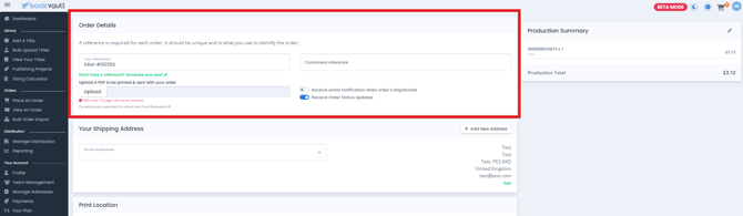 Our system will generate a unique reference, if you have a specific reference for your order, replace that with your own. You can also add a customer’s reference if they have a separate order number or invoice number from your website or CRM system. You have the ability to upload a PDF to be printed and sent with your order, this can be anything from a welcome letter, invoice or branded packing sheet. These need to be supplied as a PDF, and will be printed in black & white at the point of dispatch. You will also have the option to be notified of order status updates, or just when the book is dispatched. You can utilise the toggles seen below for this.