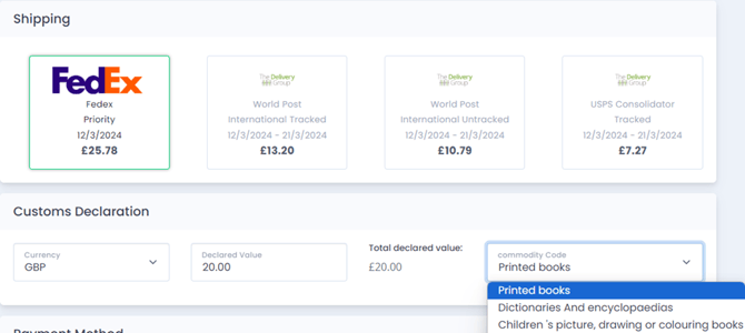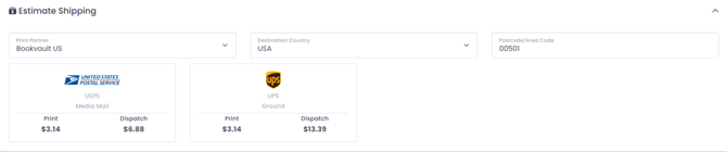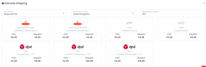 If you quickly want to get an estimate without proceeding any further, simply click on the drop down here and select the country you wish to send the books to. The relevant dispatch services will be shown with the shipping estimates back from our providers. You can also choose which print partner to print from, providing your specification is something they can print.