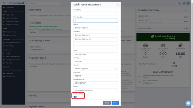 If you often send to this address you can toggle the ‘save address’ button at the bottom of this dialogue box to add to your saved addresses. If you hit the large blue ‘Save’ button once you have filled in all the relevant information