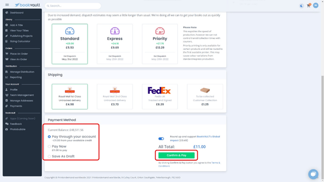 On this section you can either pay through funds already on your account, pay now or save the order as a draft to pay later. Select your option and click ‘Confirm’.