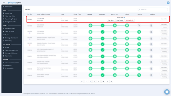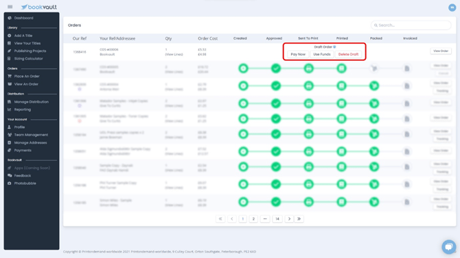 If you no longer want to proceed with the order, you can click ‘Delete Draft’ on this page. Alternatively, you can progress the order by clicking the ‘Pay Now’ or ‘Use Funds’ button