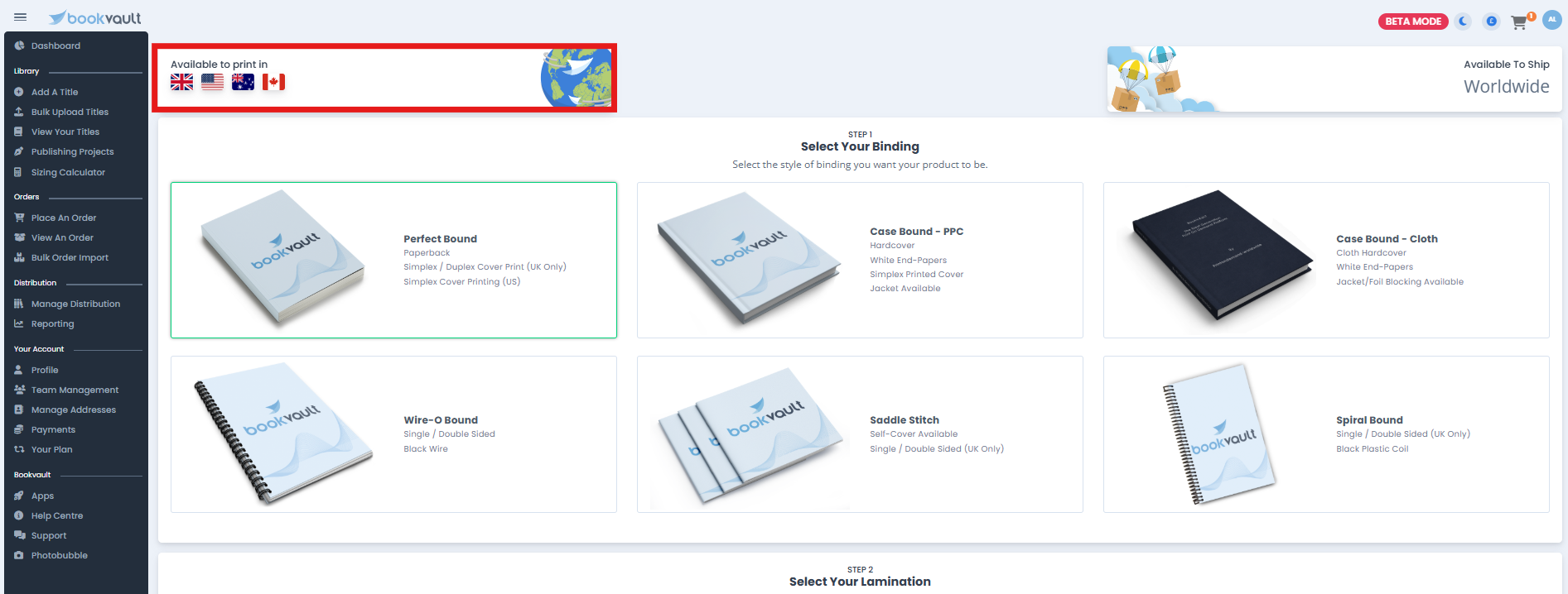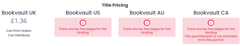 When adding a title, or using our quote tool we will indicate flags in the top right of the page. So depending on what specifications you select, these flags will be present indicating you can print with that partner. If the flag is not there, that would indicate our print partner can't fulfil the specifications you've input. The system will show the reasoning as to why our partner can't print at the bottom of the page, whether its the binding, paper stock or page count.