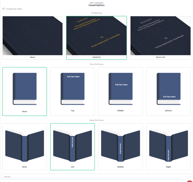 Foil stamping is only available on 'Case Bound - Cloth' books, you can choose where the text is displayed on your cover and spine, but not the back of the book as there's no stamping available there.